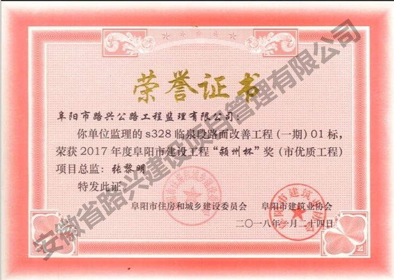 S328临泉段路面改善工程01标颍州杯荣誉证书